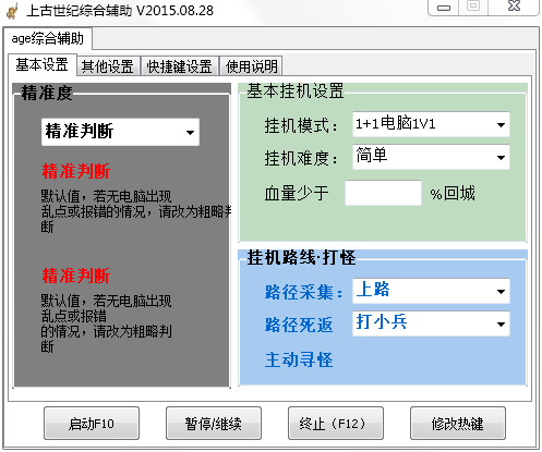 age综合辅助在挂机时,提供精准和模糊两种判断方式,支持人机对战、玩家对战等多种挂机模式,使用时游戏窗口必须设置为1024*768样式。