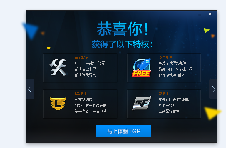 腾讯游戏平台(TGP)为玩家准备了丰富的游戏特权和礼包,还有网络加速,一键启动,极速下载和自动更新等功能,已成为腾讯游戏玩家必备的游戏工具,TGP还内置了由腾讯游戏权威出品的官方助手,如英雄联盟官方助手,为