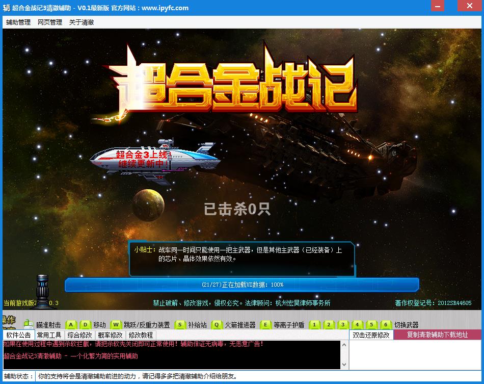 超合金战记3清澈辅助是一款专门为页游《超合金战记3》制作推出的最新游戏辅助工具,这款辅助功能丰富,拥有逆天攻击、经验修改、G币修改、充值礼包修改等等辅助功能,更多功能自己进入游戏慢慢体会。喜欢玩超合金战记3的朋友千万不可错过这款清澈辅助!