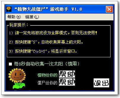 先打开游戏 "植物大战僵尸",并请一定将游戏设置为全屏模式,否则不能正常使用本助手!!!然后启动本助手程序即可开始。