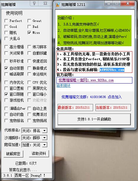 炫舞璀璨绿色区辅助是一款专为QQ炫舞玩家打造的炫舞绿色区辅助工具,这款辅助功能丰富,完美支持绿色区,同时还支持自动答题、全P、高分增强、社区瞬移、心动400、破解密码、自动钓鱼、自动上麦、演唱会Per、宠物挑战、炫舞派对、爬塔加速等等功能,如果你也需要一款qq炫舞绿色区辅助的话,那么不妨下载试试吧。