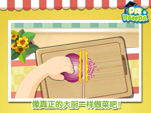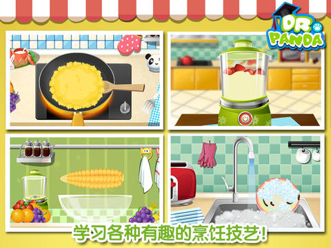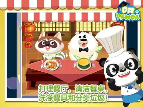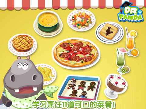 快来Dr. Panda 欢乐餐厅吧! 为小动物客人们烹饪美味可口的食物! Dr. Panda将通过有一系列充满趣味的迷你游戏将孩子们带入奇妙的烹饪世界。 孩子们将在游戏中领略并烹饪世界各地的风味美食如: 披萨饼、苹果派、玉米浓汤、中华炒菜和果味奶昔等等,更多美食尽在Dr. Panda的10种美味食谱哦!