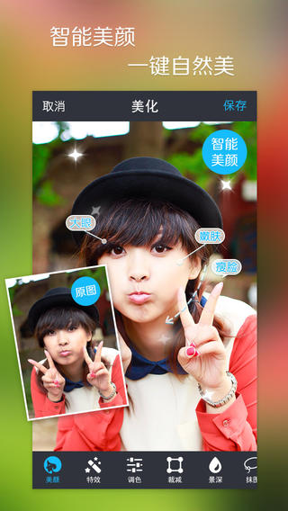 智能美颜,一键自然美。嫩肤、瘦脸、祛斑…