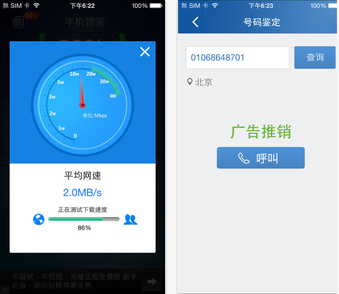 这是一款专门为苹果iPhone手机打造的手机管家软件。目前已经完美适配iOS8系统,支持最新iPhone6/iPhone6 Plus机型使用。手机管家为你的iPhone手机提供内存管理、号码鉴定、网速测试、流量管家等功能。全方位提供iPhone手机基础功能应用。