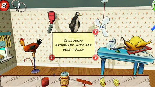 举个例子来展示一下游戏中的谜题吧!首先,你的目的是要切开一只火鸡,听起来很难的样子。你手头的工具有一只企鹅、一个木桶、一只公鸡、一盒沙子、一块海绵、一根跷跷板还有一台冰淇淋机。这些东西已经按顺序摆好,有些物品是用来互相进行衔接的。在连接它们时,你不仅要考虑到每种东西的功能,还要考虑到一些诸如重力这样的自然规律,然后就能够成功的切开火鸡,并进入到下一个关卡。