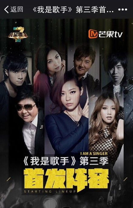 湖南卫视《我是歌手》第三季将打响明年综艺节目的头炮,歌手阵容一直吊人胃口,今天微博大号“芒果妈妈”转发了业内人士“耳帝”的微博,曝光7大歌手的名字,分别是孙楠、韩红、古巨基、张靓颖、陈洁仪、A-lin黄丽玲、胡彦斌。总导演洪涛曾透露,第三季以放眼亚洲的高度邀约唱将,阵容较前两季门槛更高。