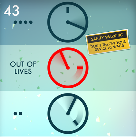 正午.NOON.,中午12点时按停时钟即可得分。《.NOON.》可以说是时钟版的《一个都不能死》,玩家要做的是当疯狂旋转的指针指向12点时,按动时钟钟面得分。最初只有2面时钟,得分高了之后会增加到三面、四面。而且指针不光会顺时针旋转,有时候还会出其不意的逆时针旋转,很是让人头疼。别的且不说,光是疯狂旋转的样子看着就让人头晕,但为毛还是忍不住想玩下去挑战高分啊?