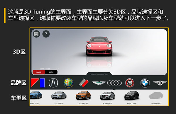 1、这就是3D Tuning的主界面,主界面主要分布为3D区,品牌选择区和车型选择区,选取你要改装车型的品牌以及车型就可以进入下一步了。