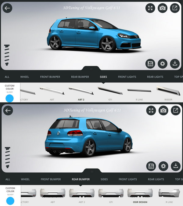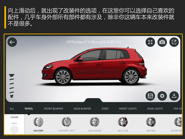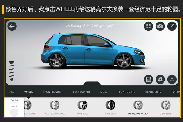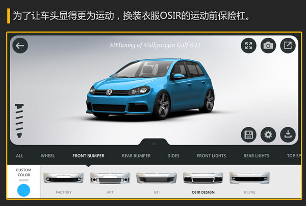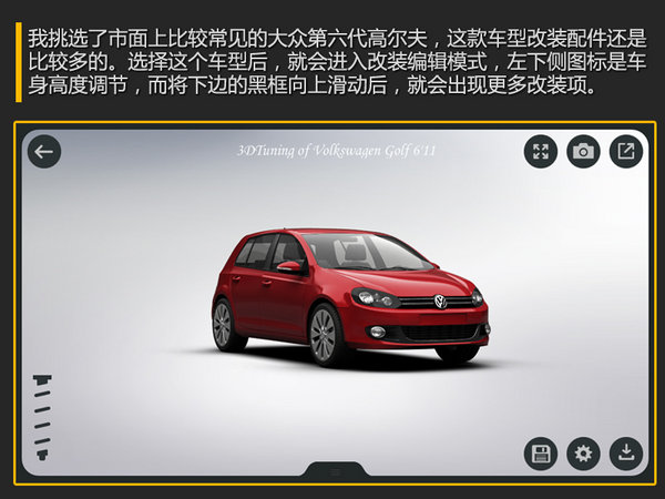 总结:经过差不多5分钟的时间,对这款软件编者玩的也不算非常娴熟,很多功能目前也没有完全琢磨透彻,不过我也对这辆普通高尔夫 (详情 图片 报价)从车身颜色、车身高度降低 、前后保险杠、侧围、大灯、中网、前机盖、轮毂、挡风玻璃膜、尾翼等等几处改装,实现了翻天覆地的变化,这样一辆独一无二的高尔夫,您是不是也有好的改进建议呢?那么你现在也下载3D Tuning一起加入改车行列吧。