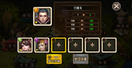当护卫满级后增加若干个个同阶护卫可以进行进化,进化后等级清零,等级上限提升。