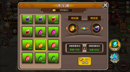 1.宝石可转换成同阶其他属性宝石,四阶和四阶以上的宝石可以花费一定费用转换为同阶的其他属性宝石。