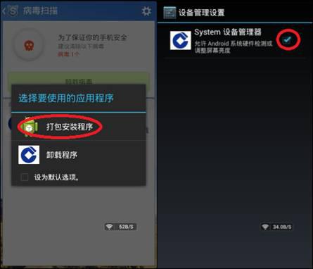 点击卸载按钮,选择设备管理器,会弹出下面右图,将对号去掉则取消了设备管理器的激活功能。即可轻松卸载该病毒软件。 如果没有弹出卸载提示窗,请通过手机设置——安全——设备管理器中进行管理。