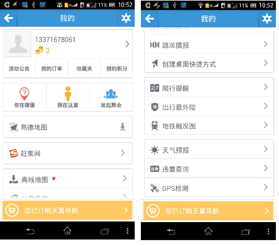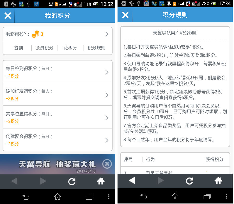 天翼导航【我的】个人中心全新改版,新增积分板块,推出每日签到、邀请好友、创建聚会、分享位置等功能,全新操作体验,使用导航乐趣多,领取积分赢大奖。