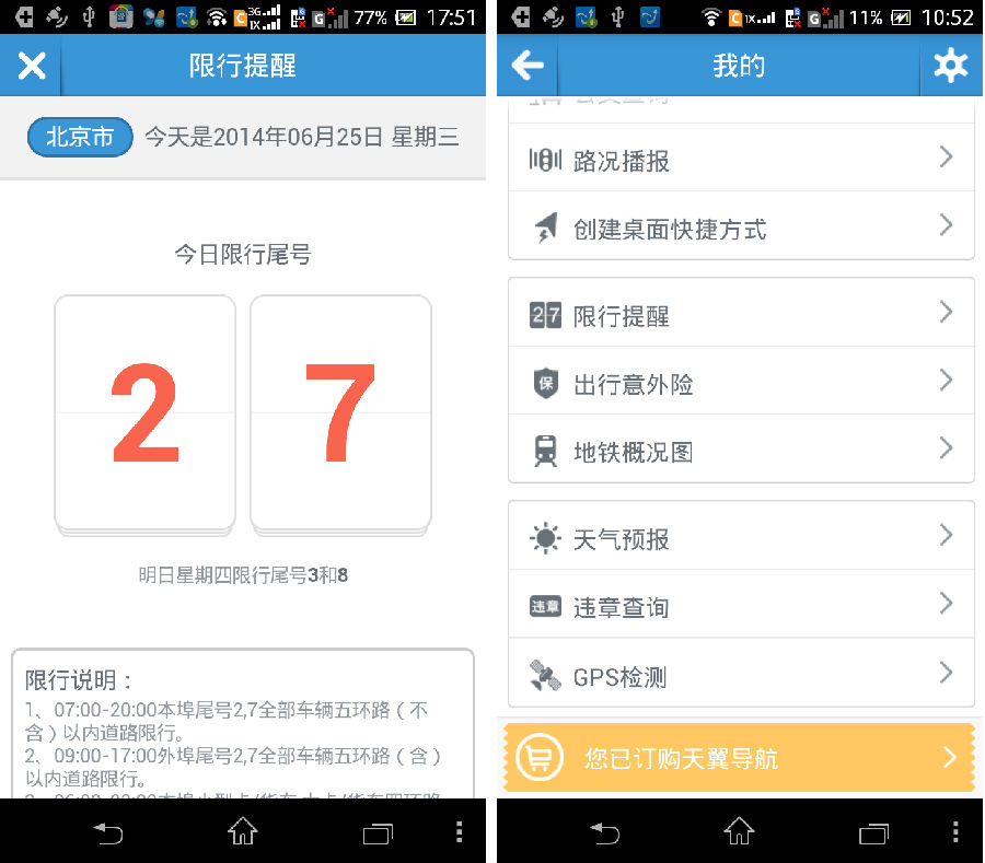 天翼导航全新推出限行信息提醒功能,驾车出门前使用限行查询,适度行驶、轻松告别罚单。只需在【我的】中找到【限行提醒】功能,今日限行尾号一目了然。