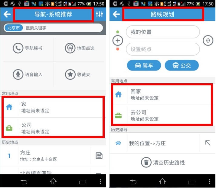 5、在导航栏目和路线规划界面增加”家”和”公司” ,一键获取回家或公司的路线。