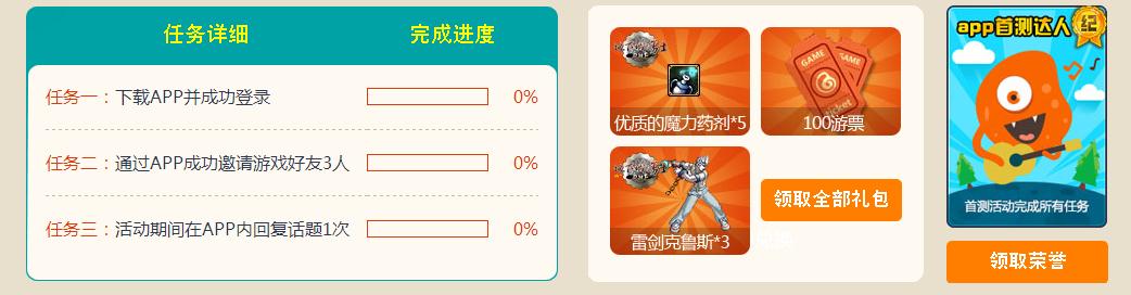 完成以下任务即可获得专属纪念荣誉“app首测达人”和礼包奖励
