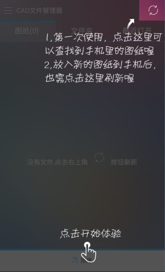1、如下图所示,第一次使用,点击右上角刷新按钮可以查找到手机里的图纸