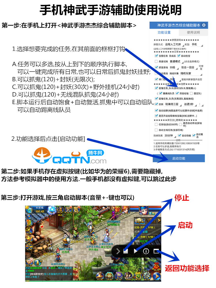 神武手游杰杰辅助脚本主要为玩家提供了额拼图游戏、日常、捉鬼、封妖、挂野等功能,支持安卓手机或安卓模拟器运行,腾牛网提示大家注意分辨率,否则无法运行。