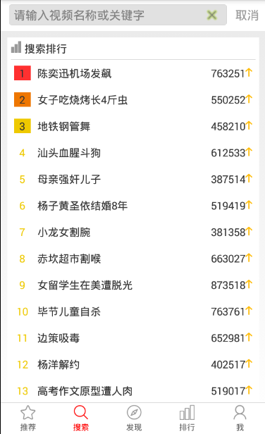 2、在搜索界面可以看到最近搜索排行榜,你可以输入视频名称或关键字来搜索内容。