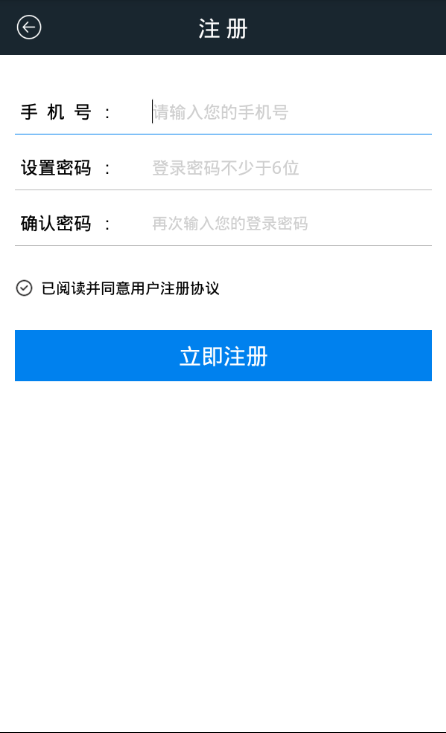 2、输入手机号以及设置密码,进行注册。(注册无需验证码)