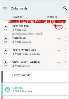 2、选择语言后,将正式进入视频制作过程,进入声音页面,选择软件自带的声音模板,点击音频左侧的播放键还可以试听。虽然声音是自带的但资源还是很丰富(这一点不同于以往社交app,操作更简单纯粹)音频资料中大多都是电影的常用语句对白或者歌词,成品可作为个人定制的视频表情反复在聊天中使用。收藏夹功能:点击星号图标即可将你喜欢的声音收藏,下载使用更加方便。