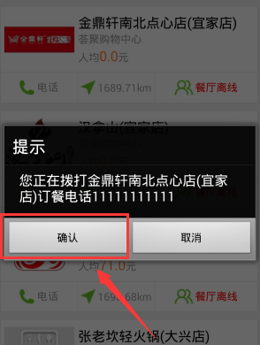 点击电话预定按钮,拨打电话热线进行预定,如图即可成功预定附近的餐馆。