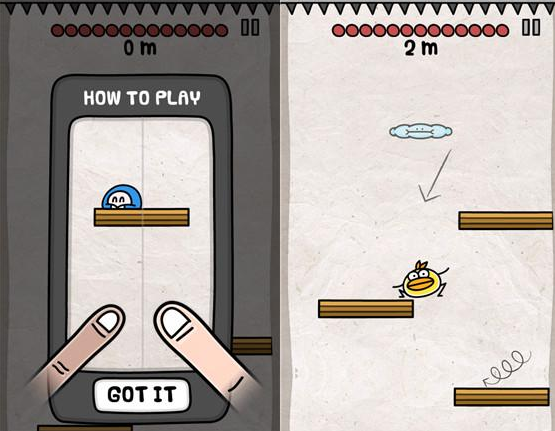 游戏的玩法也十分简单。你要操纵小鸡不停地往下掉,一边掉一边吃掉M币,吞掉奇怪的事件你还可以往下急冲哦。不过要是没来得及往下跳或者一跳掉到底了小鸡 都会死的,所以要眼明手快把握度。这款游戏采用的是点屏的方式,左边一点小鸡就往左边移动,右边一点小鸡就往右边移动,所以玩起来是非常好上手的,也很容 易沉迷……
