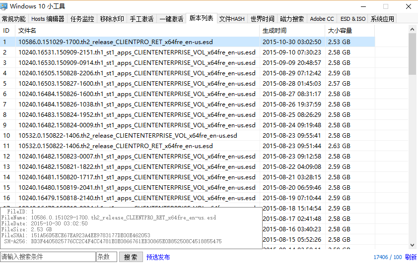 Windows 10小工具,实用的Win10小工具,集成移除水印、 KMS激活、Office激活、系统激活、ESD转换、磁力搜索、文件HASH、系统信息、系统版本、任务监控、Hosts编辑、Adobe CC激活等诸多功能。