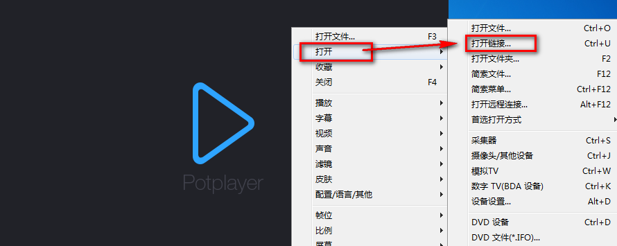 4、打开PotPlayer 播放器,在界面任意点击右键,按下图所示操作