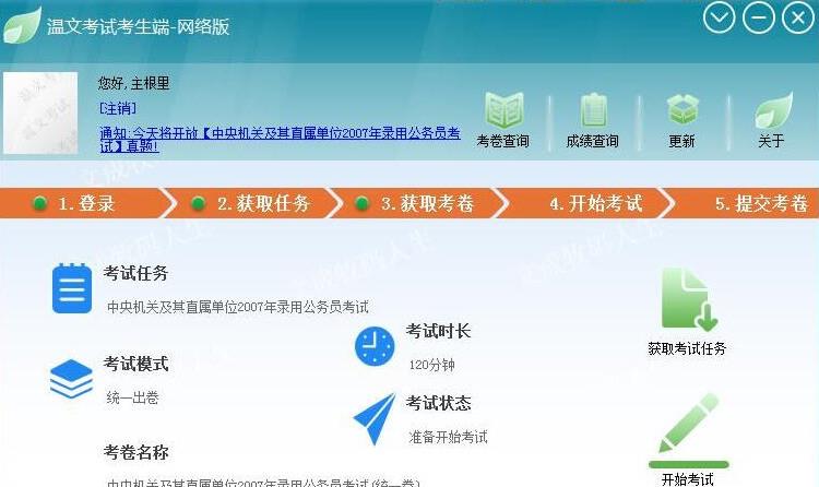 2、成功登录后点击,获取考试任务,等待从服务器获取到完整的试卷后就可以点击开始考试,进行真题测试了。