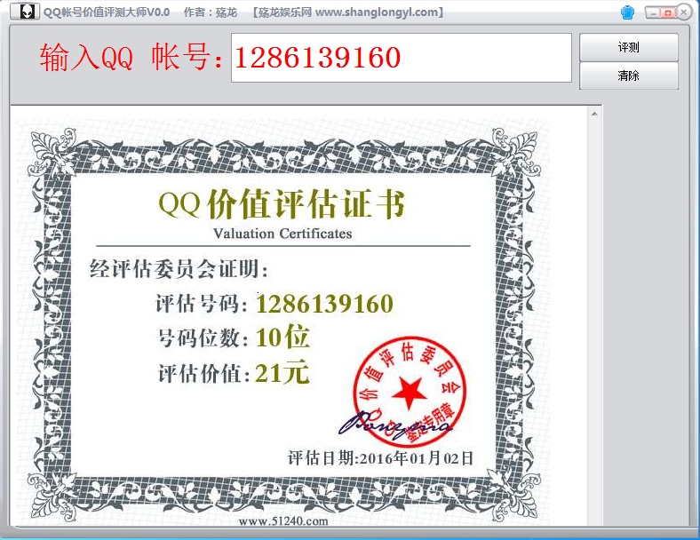 很多朋友想知道自己的qq账号到底值多少钱,那么今天小编就为大家带来这款殇龙QQ帐号价值评测大师,这是一款绿色小巧、便捷好用的QQ估价器,它能帮助你智能检测你的QQ帐号价值,只需输入你要估价的QQ号,软件会自动帮你计算,有兴趣的朋友可以来试试这款软件。