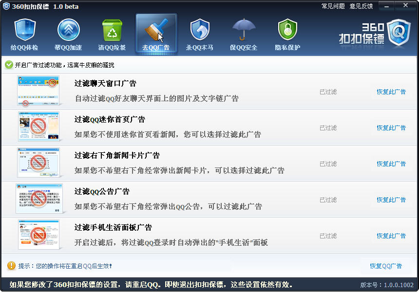 8、360“扣扣保镖”默认不修改QQ任何设置,所有功能都必须由用户主动选择触发,并可随时启用和恢复。目前仅支持QQ2009、QQ2010。