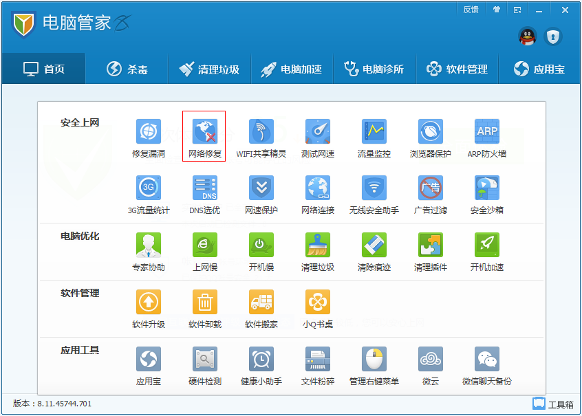 腾讯电脑管家是腾讯公司出品的一款免费专业安全软件。集“专业病毒查杀、智能软件管理、系统安全防护”于一身,开创了“杀毒+管理”的创新模式。电脑管家为国内首个采用“ 4+1 ”核“芯”杀毒引擎的专业杀毒软件,8.0版应用了腾讯自研第二代反病毒引擎,资源占用少,基于CPU虚拟执行技术能够根除顽固病毒,大幅度提升深度查杀能力。管家8.11体验版本开启啦!有没有很激动?有没有很期待呢? 那废话不多说。。。8.11版本,给XP用户更给力的保护,还有微信聊天备份。。。各种好东西,同时,版本运行将更为流畅~~