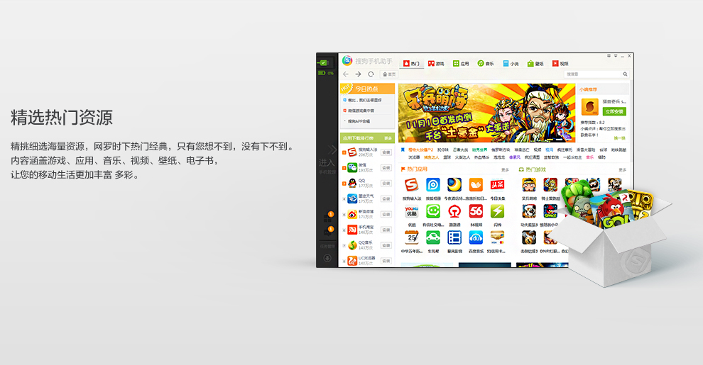 搜狗手机助手提供了热门资源,短信清理、一键优化以及备份还原等功能,是针对安卓手机开发的一款手机助手应用。搜狗手机助手分为PC电脑版和安卓手机版,在电脑上连接手机可以对手机上的资源做出快速的管理工具;在手
