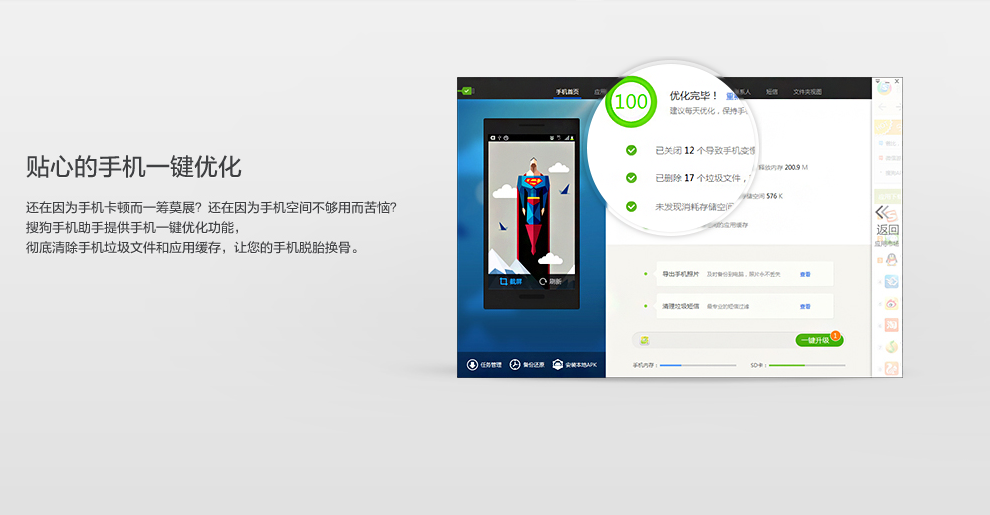 搜狗手机助手提供手机一键优化功能,彻底清除手机垃圾文件和应用缓存,让您的手机脱胎换骨。