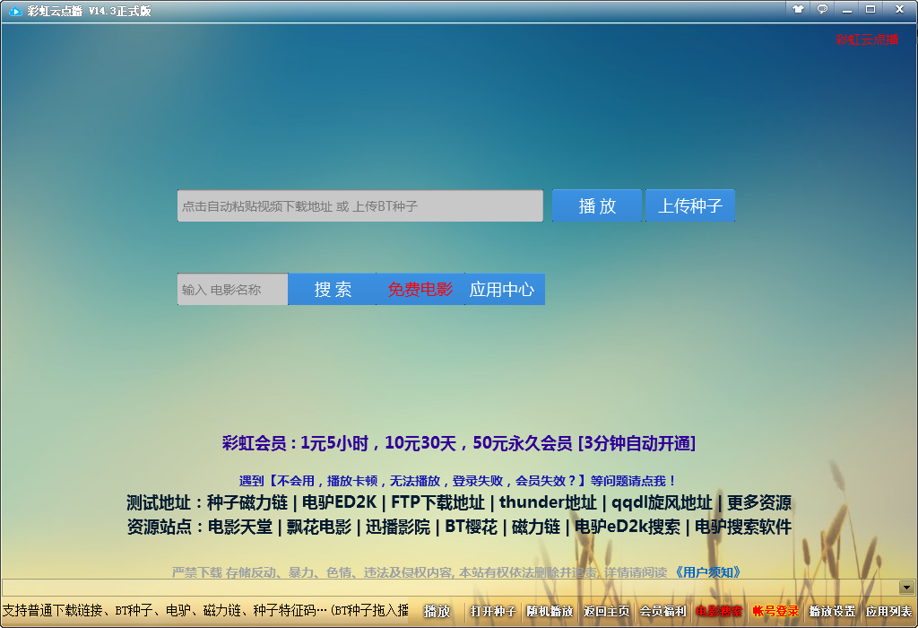 什么是彩虹云点播?彩虹云点播支持直接播放电影链接,例如电驴ed2k、迅雷thunder、磁力BT链接magnet、普通下载http、ftp等等开头的网址。彩虹云点播方法:找到需要的电影连接,复制到地址框,点击播放即可!BT种子播放