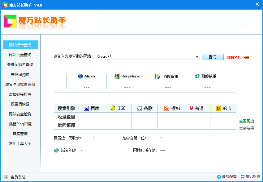 魔方站长助手具备一键极速查询功能,绿色软件永久免费,是万千站长的必备工具,赶紧下载吧。