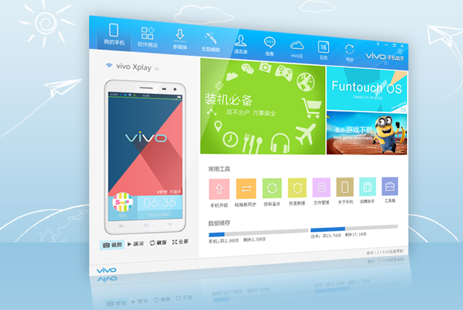 vivo手机助手主要拥有软件商店、手机主题编辑、多媒体管理、vivo云、联系人管理、短信彩信管理等功能,可以通过手机客户端和pc客户端管理你的手机,并与迅雷合作,极速下载应用不是问题,而且还非常节省流量。vivo手