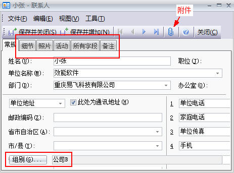 2.单击“新联系人” ,即可添加联系人信息。您还可以为联系人添加附件、照片、备注等信息。除此之外,还可以设置联系人的生日提醒,进行分组管理等。