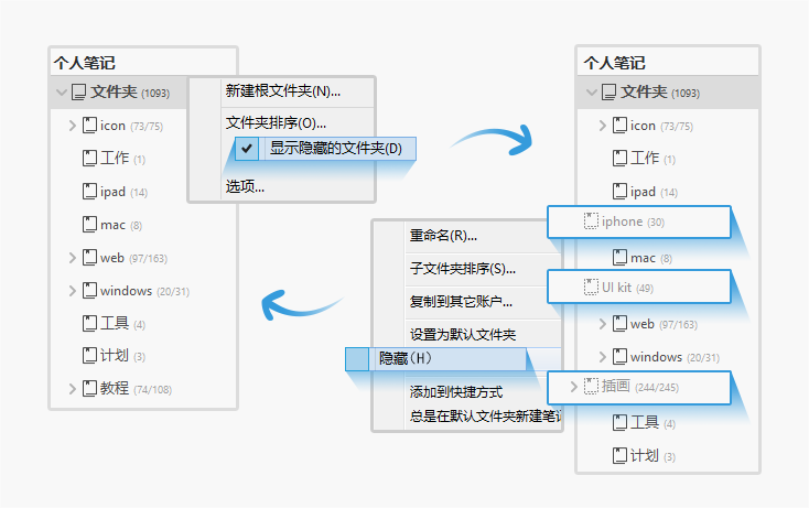 若想查看隐藏的文件夹以完成更多操作,可以在个人笔记下的“文件夹”处右键-显示隐藏的文件夹,之后所有隐藏的文件夹将显示出来(比正常文件夹颜色浅)。