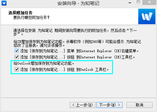 安装时出现提示:按照默认勾选:添加“保存到为知笔记”按钮到Outlook 工具栏。