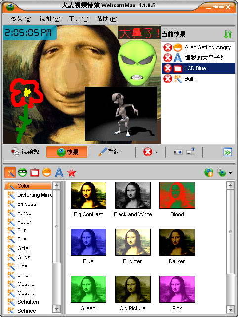 网络视频视频聊天软件哪个好?大麦视频特效WebcamMax是一款全新的网络视频视频聊天效果软件。支持所有的网络视频软件,MSN, QQ, UC,AIM, MSN, Camfrog, Skype, Paltalk, Yahoo Messenger等等。支持超过1896种效果,包括镶嵌效果, TV墙纸, 电影情景,水、烟雾、表情等。为网络摄像头添加视频、屏幕、图片、Flash以及各种丰富多彩的魔幻效果,并且可以在所有即时消息软件上实时播放。而且即使你没有摄像头也同样可以使用。
