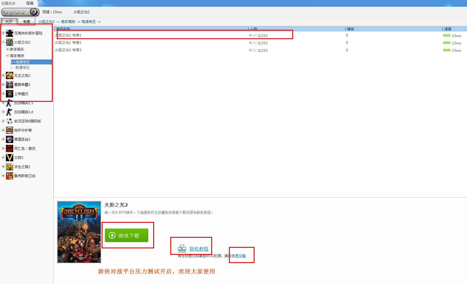 上图,左边是游戏的列表,找到游戏选择好房间,双击加入;下面是这个游戏的简介和下载地址,以及联机教程和意见箱。