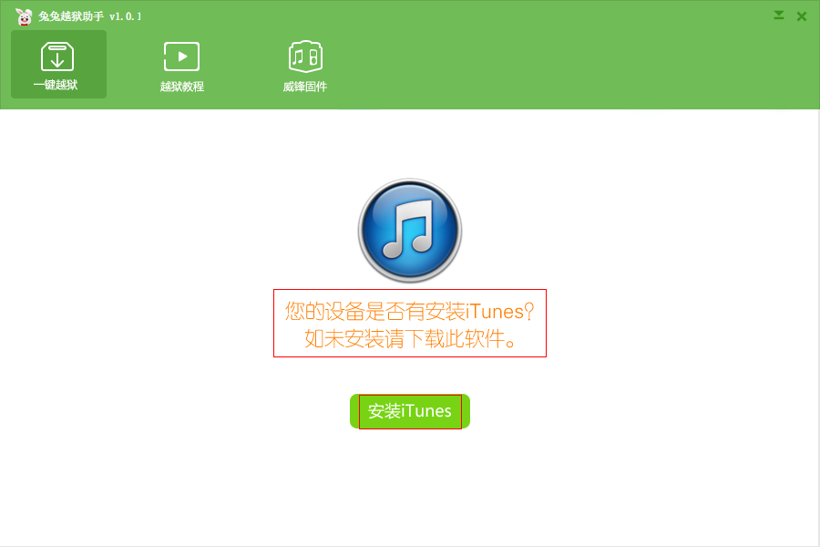 1下载后可直接打开兔兔越狱助手,如果你还没安装iTunes,根据你的电脑系统安装iTunes for Windows或itunes for mac