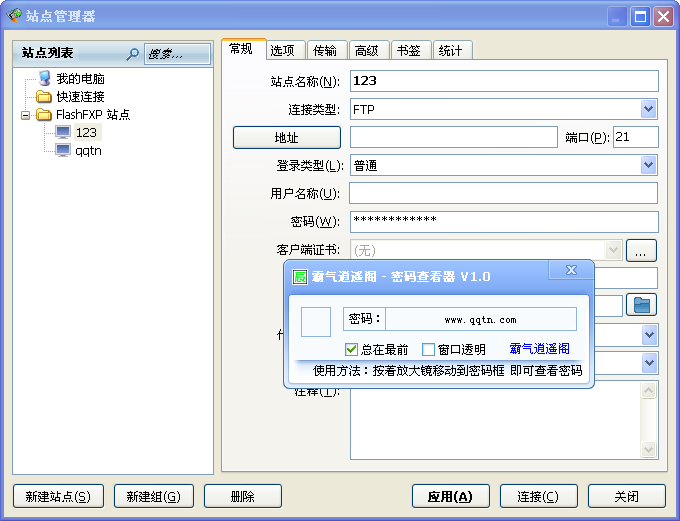 霸气逍遥阁密码查看器可以查看星号密码框中的密码,以备不时之需,比如忘记了FTP站点的密码,使用本工具即可顺利查看。