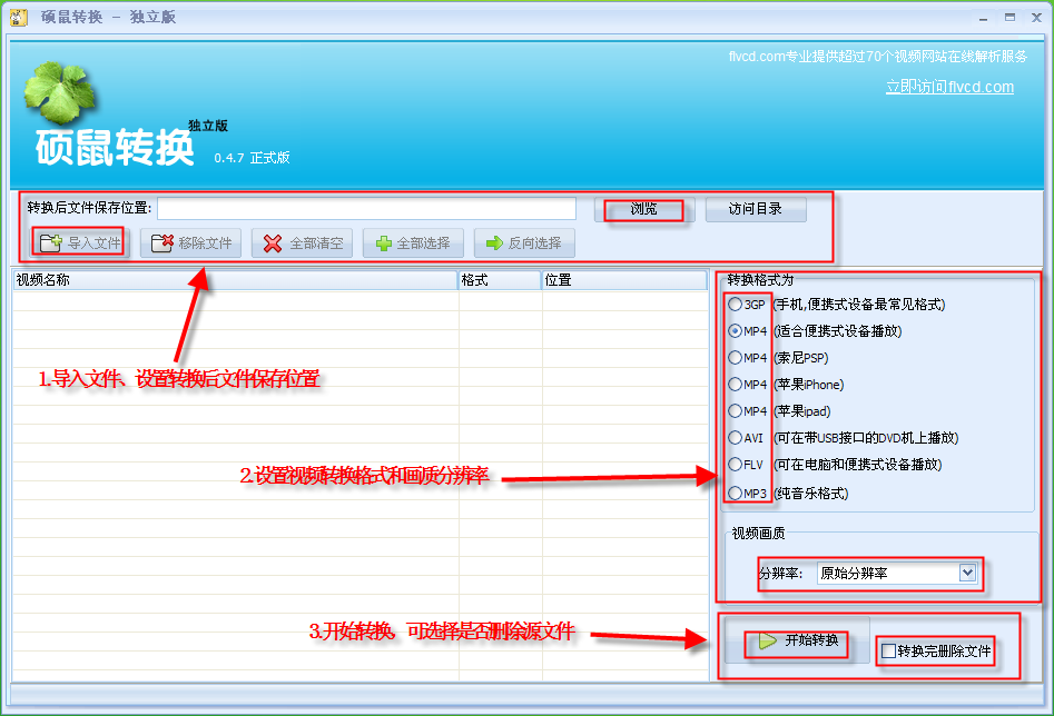 硕鼠转换独立版可以将硕鼠下载的flv格式的文件转换成3GP、MP4、AVI、FLV、MP3等格式,适合iPhone、iPad等设备播放。