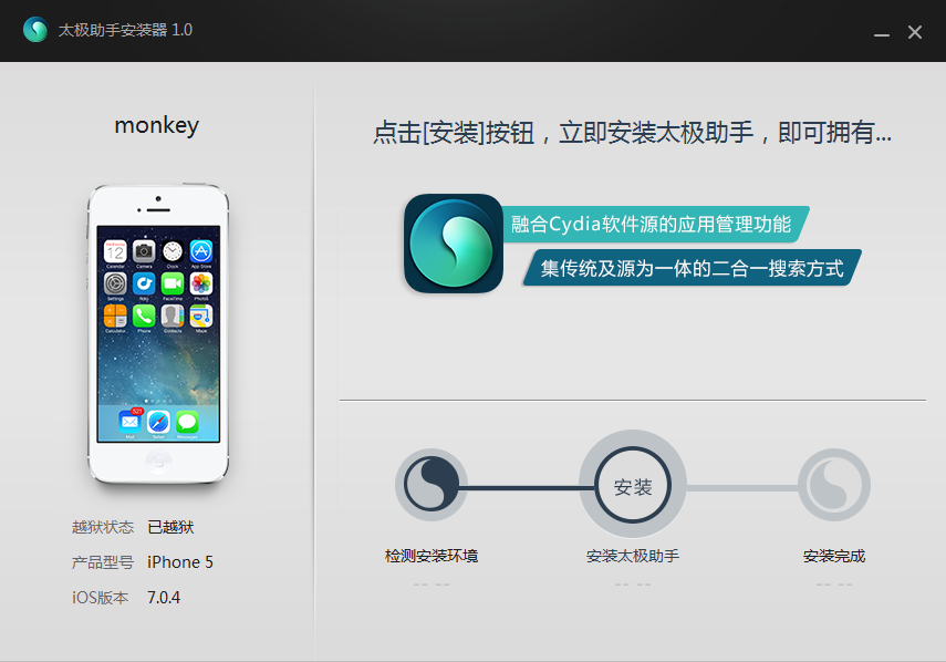 太极助手安装器是针对已越狱的主流苹果设备,安装、更新最新版太极功能的PC端工具,太极助手,兼容IOS7系统且与Cydia越狱无冲突,请放心安装!