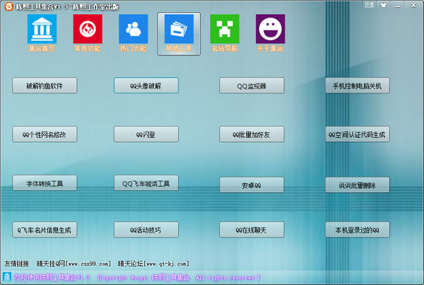 陈熙网络工具集合提供了IE恶搞、空间互踩、图标点亮助手、MC音效器、各类信息查询、提取网站软件图标、免费短信电话、QQ各类美化功能、火星文解码转换、二维码生成、文本朗读、HTML编辑、常用系统等功能,是集合各类实用功能与一体的实用工具箱。