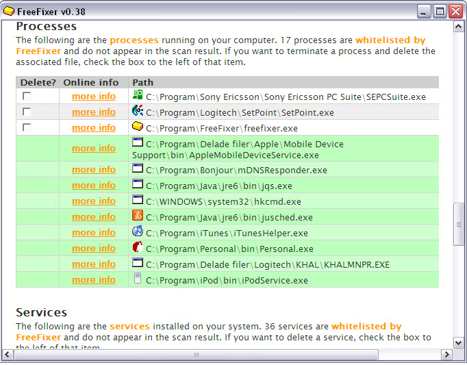 截图展示了一些FreeFixer的扫描结果。列出的文件与绿色背景上的信任的文件列表FreeFixer。白色/灰色的背景文件是未知的FreeFixer,所以不能说的话。(在这种情况下,他们都是合法的文件)。