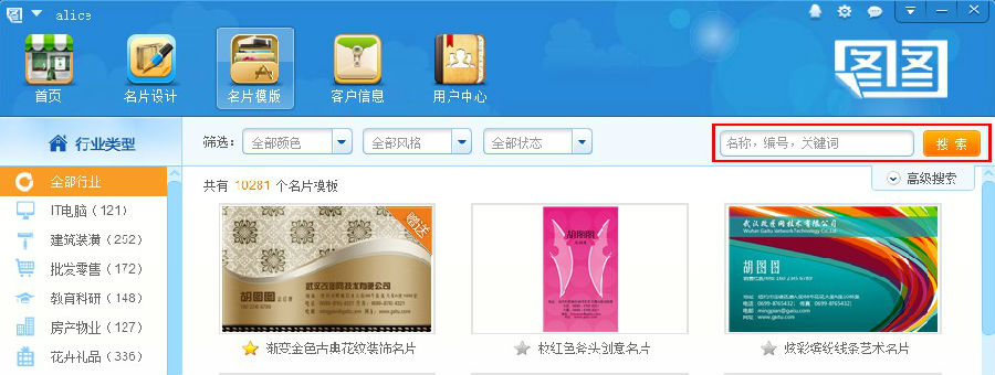 登录图图,在“名片模板”中选择适合您的模板。可通过颜色及行业分类快速筛选及查找。